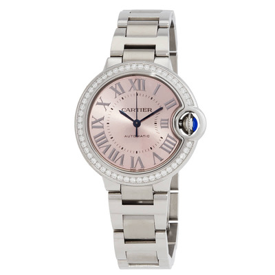 Silver-tone stainless steel case and bracelet, fixed silver-tone bezel set with diamonds. Pink dial featuring Roman numeral hour markers (Analog). Automatic movement. Scratch-resistant sapphire crystal. Fluted crown accented by a synthetic cabochon-shaped spinel. Solid case back. Round shape, 33mm diameter, 12.06mm thickness. Water resistant to 30 meters / 100 feet. Functions: Hours and Minutes.