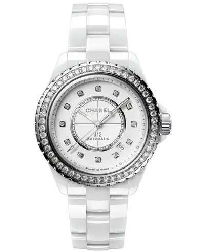 An authentic new Chanel J12 watch model H71189. Features a white ceramic case, white ceramic bracelet, deployment with push button and foldover clasp closure, fixed bezel set with diamonds, white dial accented by silver tone hands and diamond hour markers along the outer rim. Equipped with an automatic movement powered by Chanel Calibre 12.1 engine providing functions for hour, minute, second, and date display. Protected by a scratch-resistant sapphire crystal lens in round case shape measuring 38mm diameter and 12.6mm thickness. Comes with solid case back and offers water resistance up to 50 meters (165 feet). Includes WatchMaxx warranty coverage for two years.