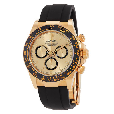 Men's Automatic Chronograph with Yellow Gold Dial and Black Rubber Strap. Features a fixed black Cerachrom Tachymeter Bezel, luminous analog hands and markers, three sub-dials for 30 Minute / 12 Hour / 60 Second functions, Sapphire Crystal, screw-down crown, solid case back, Oysterlock clasp, water resistant to 100 meters (330 feet), powered by Calibre 4131 movement with approximately 72 hours power reserve at full winding.