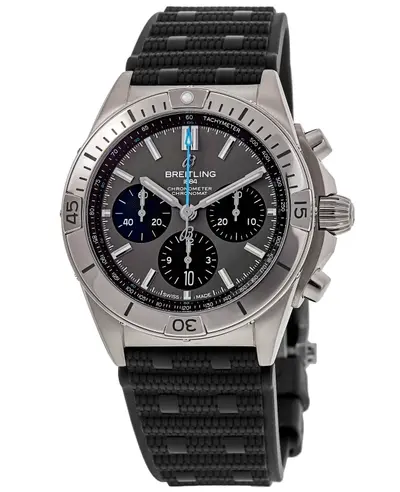 Brand New Authentic Breitling Chronomat B01 42. Automatic chronograph movement with Swiss Caliber 01 engine and 70 hours power reserve. Features a grey dial with luminous silver tone hands featuring stick hour markers, tachymeter on the outer rim, minute markers at the 3 o'clock positions, and three sub-dials displaying date, seconds, 12 hours, and 30 minutes respectively. Equipped with unidirectional rotating bezel, titanium case in brushed and polished finish, black rubber strap secured by a folding clasp. Additional functions include chronometer accuracy, scratch resistant sapphire crystal glass, round shape measuring 42mm diameter and 15.10mm thick, transparent case back, and is water resistant to 200 meters (660 feet). Comes with a manufacturer's 5-year WatchMaxx warranty.