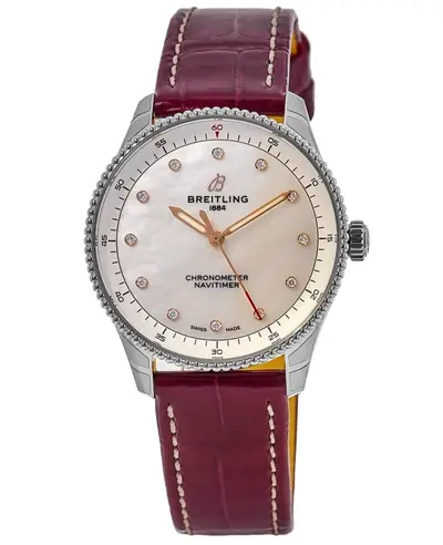Burgundy leather strap, polished stainless steel case with solid clasp and bezel. White mother-of-pearl dial accented by luminous rose gold tone hands and diamond hour markers on a sapphire crystal case back. Swiss SuperQuartz movement powered by Caliber 77 engine features thermocompensation and water resistance up to 50 meters.