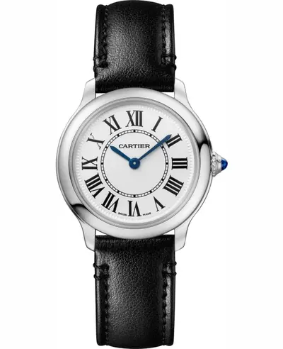 An authentic Cartier women's wristwatch model WSRN0030. Features a stainless steel case, black leather strap with tang clasp. The silver dial is accented by blue hands and Roman numeral hour markers with minute markers along the inner rim. Powered by a battery-operated quartz movement. Includes hours and minutes functions, scratch-resistant sapphire crystal, round shape measuring 29mm in diameter and 7.54mm thick. Water resistant to 30 meters (100 feet). Comes with a 2-year WatchMaxx warranty.