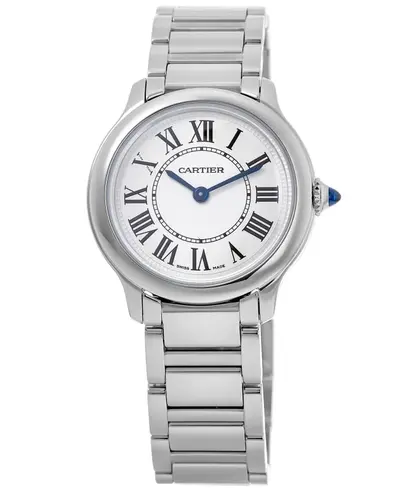 An authentic Cartier women's watch featuring a silver dial and steel bracelet. Includes Roman numeral hour markers, minute markers around the inner rim, blue hands, scratch-resistant sapphire crystal, round case shape measuring 29mm in diameter with thickness of 7.54mm, battery-operated quartz movement, water resistance up to 30 meters (100 feet), and comes with a 2 year WatchMaxx warranty.