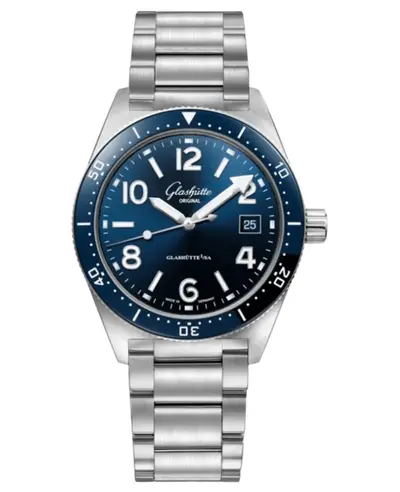 Brand new authentic Glashütte Original SeaQ Automatic watch. Features a brushed and polished stainless steel case coupled with a matching bracelet band, powered by a German automatic movement (Caliber 39-11) offering 40 hours power reserve. Blue ceramic inlay dial includes luminous silver tone hands marked with Arabic numerals and stick indices, along with minute markers around the outer rim; date window at the 3 o'clock position on a galvanized blue surface. Equipped with an unidirectional rotating bezel, scratch-resistant sapphire crystal, screw-down crown, and is water resistant up to 200 meters (660 feet).