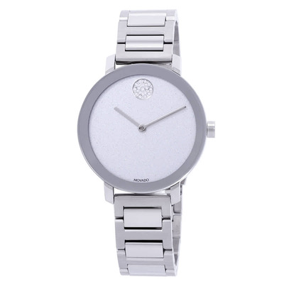 Stainless steel case with a stainless steel bracelet. Fixed stainless steel bezel. Silver glitter dial with silver-tone hands. No markjers. The Movado dot appear at the 12 o'clock position. Dial Type: Analog. Quartz movement. Scratch resistant K1 mineral crystal. Pull / push crown. Solid case back. Round case shape. Case size: 34 mm. Fold over clasp. Water resistant at 30 meters / 100 feet. Functions: hour, minute. Bold Evolution Series. Dress watch style. Watch label: Swiss Made. Movado BOLD Evolution Silver Glitter Dial Ladies Watch 3600732.