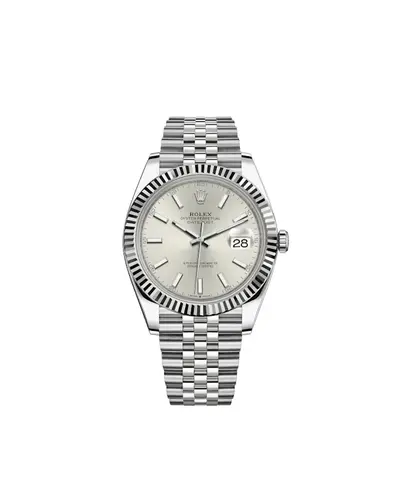 Brand New Authentic Rolex Datejust 41 in silver dial. Features a polished stainless steel case, brushed and polished matching bracelet with crownclasp closure. Equipped with luminous hands and index hour markers on the silver dial. Powered by automatic chronometer movement Calibre 3235 offering 70 hours power reserve display. Includes date function, scratch resistant sapphire crystal, fixed fluted bezel, solid case back for water resistance up to 100 meters (approx. 330 feet). Comes with a 5 year WatchMaxx warranty.