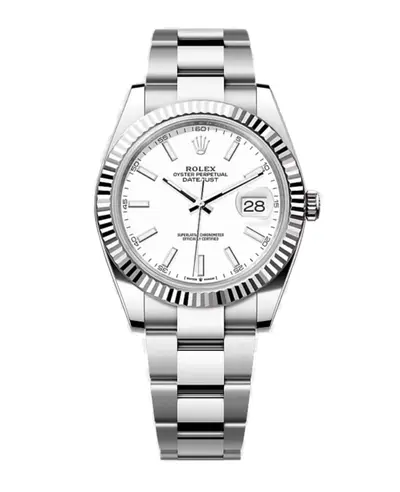 Brand new authentic Rolex Datejust model M126334-0009. Polished stainless steel and white gold case, paired with a polished stainless steel Oysterclasp bracelet band. Features fixed bezel, luminous silver-tone hour hand and index markers on the white dial displaying the date at 3 o'clock. Equipped with an automatic chronometer movement powered by Rolex Calibre 3235 mechanism offering a 70-hour power reserve. Water resistant up to 100 meters (approx. 330 feet). Includes 5 year WatchMaxx warranty.