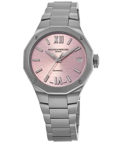 The Baume & Mercier Riviera Automatic watch features a pink dial with silver tone hands and Roman numeral/index hour markers. The case and bracelet are both crafted from brushed and polished stainless steel. This automatic movement is powered by the Sellita SW200 engine, includes a date function, has a power reserve of 38 hours, measures 33mm in width and 9.57mm thick, comes with a transparent sapphire case back, boasts a water resistance depth of 50 meters or 165 feet, and is covered by a 2-year WatchMaxx warranty (model number M0A10675).