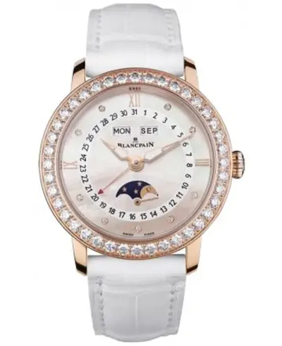 A ladies complete calendar moonphase watch. Rose gold case with white crocodile leather strap and deployment clasp, diamonds on bezel, mother of pearl dial. Equipped with automatic self winding movement, scratch resistant sapphire crystal lens, transparent case back. Dimensions: 35mm diameter, 10.57mm thickness. Water resistant to 50 meters / 150 feet depth and comes with a 2 year WatchMaxx guarantee.