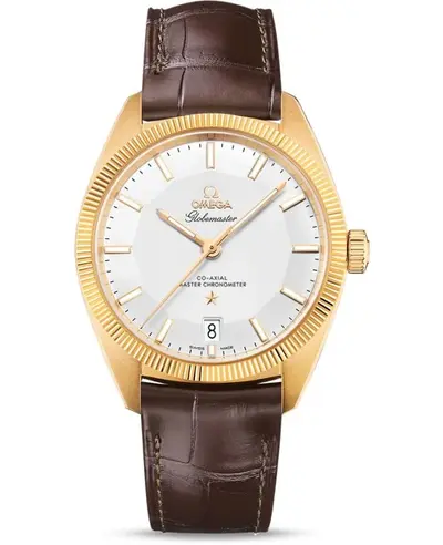 New authentic Omega Constellation Globemaster men's watch. Features an 18kt gold case, brown alligator leather strap with deployment clasp. Silver dial equipped with gold-tone luminous hands and hour markers. Powered by automatic self-winding movement. Secured by push-in crown access. Protected by scratch-resistant sapphire crystal. Case measures 39mm in diameter. Includes transparent case back and comes with a 5 year WatchMaxx warranty providing water resistance up to 100 meters (approximately 330 feet).