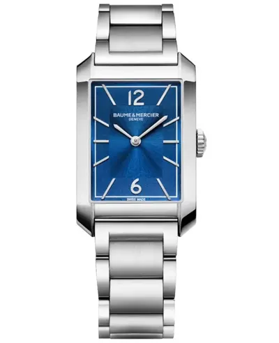 This authentic Baume & Mercier Hampton quartz watch, model number 10754 (also known as MOA10754), features a new polished stainless steel case and matching polished stainless steel band. It includes smooth bezel with polished rhodium-plated hour markers and elegant stick Arabic numerals on its blue sunray dial surface; the hands are also crafted in polished rhodium-plated stainless steel. Powered by a reliable Swiss quartz movement, this men's timepiece provides precise hour and minute functions via its push-pull crown setting. The sapphire crystal display is resistant to scratches for enhanced durability. Its rectangular case measures 27.50mm x 43mm with an overall thickness of 8.65mm. Characterized by a solid case back, this watch comes equipped with water resistance up to 50 meters (equivalent to approximately 165 feet) and includes the manufacturer's WatchMaxx warranty for two years.