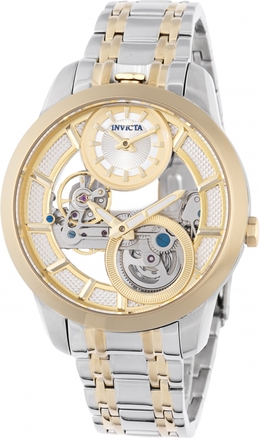 Silver-tone stainless steel case with a two-tone (gold and silver-tone) stainless steel bracelet. Fixed gold-tone stainless steel bezel. Gold dial with gold-tone hands and index hour markers. Dial Type: Analog. Luminescent hands. 12 hour / 60 minute subdials. Caliber LG0807, 763 hand wind movement. Scratch resistant Flame Fusion crystal. Push, push crown. Transparent see through case back. Round case shape, case size: 43 mm. Band width: 20 mm, band length: 7.25 inches. Fold over safety clasp. Water resistant at 100 meters / 330 feet. Functions: hour, minute, two time zone. Objet D Art Series. Casual watch style. Invicta Objet D Art Hand Wind Gold Dial Mens Watch 44333.