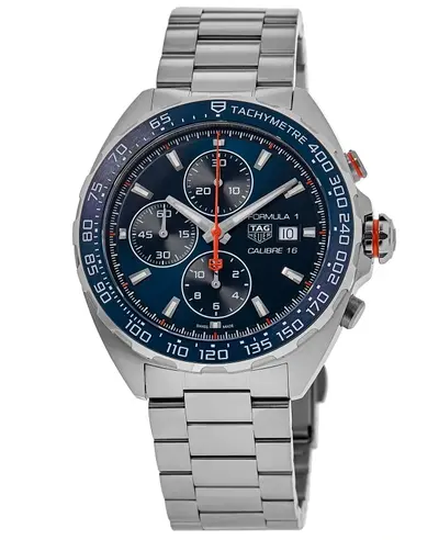 Authentic Tag Heuer sports chronograph watch model CAZ201G.BA0876. Features brushed/polished stainless steel case and bracelet, deployment buckle with push-button fold-over clasp (fixed). Includes tachymeter bezel function. Equipped with luminous silver-tone hands and stick hour markers featuring minute submarkers around the outer rim on a blue sunray dial. Display includes three central sub-dials for 1/10th second, minutes past twelve, hours + minutes, date at 3 o'clock (also displayed). Movement is Swiss automatic mechanical chronograph with screw-down crown powered by Calibre 16 engine providing 42-hour power reserve. Sapphire crystal scratch-resistant display, round case shape measuring 44mm diameter and 15mm thickness, solid case back. Water resistant to 200 meters (approx. 660 feet). Comes with a standard 2-year WatchMaxx warranty.