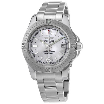 Silver-tone stainless steel case and bracelet with unidirectional rotating bezel, mother of pearl dial accented by luminous hands and index hour markers including Arabic numerals at 6 & 12 o'clock positions along with minute and 1/100th markers around the outer rim. Analog display featuring a date window located at the 3 o'clock position powered by Breitling Calibre 77 quartz movement, sapphire crystal glass resistant to scratches, screw-down crown, solid case back, round shape measuring 33 mm in width and thickness of 9.1 mm. Includes deployment clasp with band width adjusting between 16-14 mm (approx.) and total length around 8.5 inches. Water resistant up to 200 meters / 660 feet.