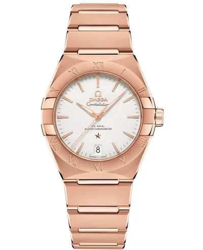 A brand new authentic Omega watch model 131.50.36.20.02.001, featuring a Sedna™ Gold case with both brushed and polished finish. Includes a deployment clasp with push button for the Sedna™ Gold bracelet. The fixed bezel is set in silver likely containing minute markers. A classic round 36mm case houses a stunning silver dial accented by rose gold colour hour, minute, and second hands combined with luminous index hour markers and minute markers along the outer rim. Powered by an automatic Omega Calibre 8801 movement renowned for its precision chronometer rating, offering approximately 55 hours of power reserve which is displayed on the case back or dial alongside the date function shown at the three-quarter position. The sapphire crystal provides excellent scratch resistance and clarity over the dial.