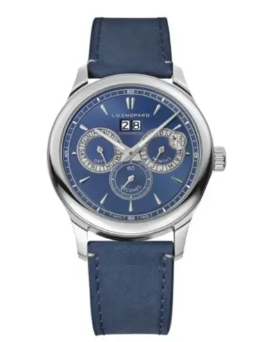 Automatic Movement, Caliber LU C 96.22-L Engine, Blue Dial, Date Display at 12 o'clock, Day of Week Display, Hour Markers Index, Month Display, Minute Markers Outer Rim, Power Reserve Indicator (Sub-dial), Sapphire Crystal, Stainless Steel Case, Strap: Blue Calfskin Leather with Tang Clasp, Sub-Dials for Chronograph Seconds/Minutes and Day/Month Functions, Water Resistance 30 Meters
