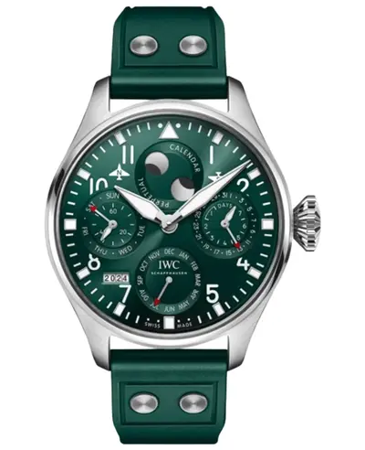 Authentic IWC Big Pilot's Perpetual Calendar men's watch model IW503608. Features a stainless steel case with green rubber strap and polished folding clasp. Includes fixed bezel, luminous silver tone hands, Arabic numeral hour markers with minute markers on the outer rim, and four sub-dials displaying perpetual calendar functions (date), month, day of week, moon phase, power reserve, 60-second chronograph, and time. Powered by IWC Calibre 52616 automatic movement with 168-hour power reserve. Equipped with screw-down crown, sapphire crystal glass resistant to scratches, round case measuring 46.2mm in diameter and 15.4mm thick. Comes with a transparent case back, is water-resistant up to 60 meters (200 feet), features day/night date display capability, includes moon phase function, hour, minute, second hand, power reserve indicator, perpetual calendar, has a fixed central chronograph sub-dial for seconds, and month/day of week sub-dials. Includes a standard WatchMaxx warranty covering 2 years.