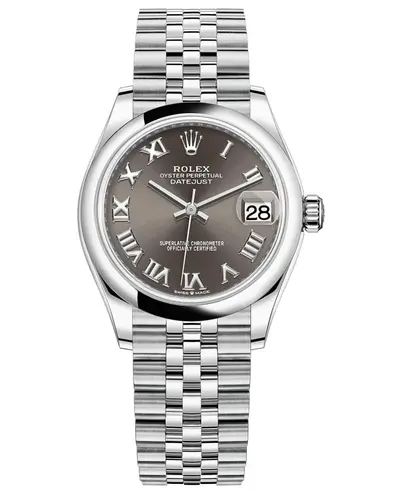 Authentic Rolex Datejust. Polished stainless steel dark grey case with polished stainless steel bracelet and crownclasp clasp. Fixed-domed bezel, dark grey dial featuring polished silver hands, roman numeral hour markers, and date window. Automatic chronometer movement powered by Calibre 2236 with 55 hours power reserve. Functions include: Date Display, Hour, Minute, Second Hand visible. Scratch resistant sapphire crystal. Round case shape measuring 31mm diameter. Solid case back. Water resistant to 100 meters (330 feet). Includes a standard 5-year warranty.