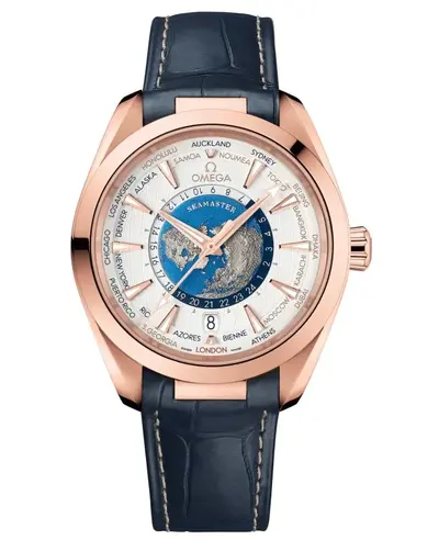 A new authentic Omega Seamaster Aqua Terra watch featuring a Master Co-Axial Chronometer movement with GMT function and World Timer complication on an elegant silver dial. The case is crafted from 18Kt Rose Gold, measuring 43mm x 14.3mm thick. Equipped with luminous hands and index hour markers for easy reading in low light conditions. Secured by a deployment push-button fold-over clasp closure and features a fixed bezel along with scratch-resistant sapphire crystal glass protecting the dial surface. Comes with an additional blue alligator leather strap, complementing its automatic power reserve of 60 hours driven by Calibre 8939 engine. The watch displays date functions alongside standard timekeeping including GMT/24-hour and seconds hands. It is rated to 150 meters or approximately 495 feet for water resistance against splashes.
