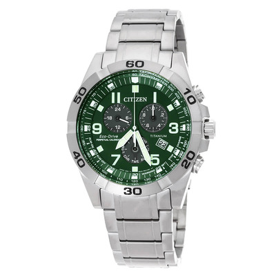 Silver-tone super titanium case and bracelet, Silver-tone super titanium bezel, Green dial with silver-tone hands and Arabic numeral hour markers, Tachymeter scale around the outer rim, Analog dial type, Luminescent hands and markers for enhanced readability in low light conditions, Perpetual calendar function including month, date display, leap year capability, Chronograph equipped with three sub-dials: 60-second countdown timer, 24-hour dual time zone indicator, precise 1/20th second measurement, Solar-powered Eco-Drive movement (Citizen Caliber E820), Features battery end-of-life (eol) indicator, Water resistant to 100 meters / 330 feet making it suitable for swimming and snorkeling, Round case shape measuring 43 mm in diameter, Secure fold over clasp closure, Mineral crystal with scratch-resistant properties. Functions: perpetual calendar, leap year calculation, chronograph timer, alarm function, second time zone display, hour hand, minute hand, date window, precise seconds measurement, battery eol indicator (visual), solar-powered operation.