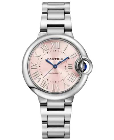 A brand new authentic Cartier Ballon Bleu de Cartier women's watch with automatic pink dial and steel case. Features a polished stainless steel case coupled with a brushed and polished stainless steel bracelet band equipped with a folding clasp. The fixed bezel adds classic appeal. Dial includes polished blue hour, minute, and second hands along with Roman numeral markers and further minute markers arranged around the inner rim on a pink sunray dial surface. Powered by an automatic self-winding movement known for its power reserve capability, offering functions including hours, minutes, seconds, and power reserve indication via push-pull mechanism. The fluted crown is set with a synthetic Cabochon Shaped Spinel. Features sapphire crystal lens resistant to scratches ensuring crystal clarity. Possesses round shape in 33mm case size measuring approximately 10.16mm thick. Includes solid case back and provides water resistance suitable for shallow depths up to 30 meters or roughly 100 feet, accompanied by a comprehensive WatchMaxx warranty covering two years.