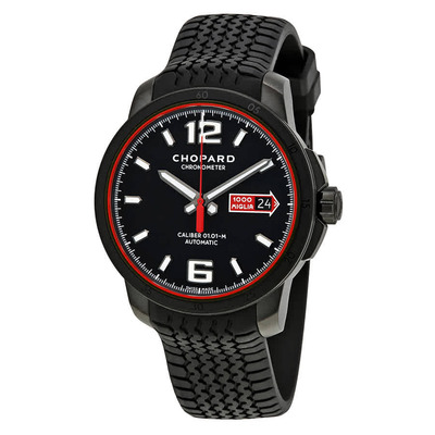 Analog automatic watch from Chopard. Features a black DLC stainless steel case, fixed black DLC bezel, and a black rubber strap with tang clasp. The dial is black with luminous hands and index hour markers including Arabic numerals at the 6 and 12 o'clock positions; minute markers are present on the outer rim. A date display appears at the three o'clock position. Comes equipped with a scratch-resistant sapphire crystal glass, pull/push crown, transparent case back, round case shape measuring 43mm in diameter and 11.3mm thick. Water resistant up to 100 meters / 330 feet depth. Functions display hour, minute, second, date.