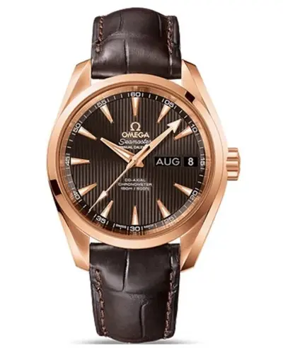 A brand new authentic Omega Seamaster Aqua Terra watch with an automatic chronometer movement and a brown dial. The case is crafted from 18kt rose gold, equipped with a deployment clasp, fixed bezel, sapphire crystal for scratch resistance, and a screw-down crown. Features include an alligator leather strap in brown, transparent case back displaying the mechanism, and water resistance up to 150 meters (approximately 500 feet). Backed by a 5 year WatchMaxx warranty.