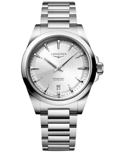 Polished stainless steel case, polished stainless steel bracelet band with deployment clasp and push button mechanism. Features a smooth bezel and a silver sunray dial with luminous stick hour markers, minute markers on the outer rim, and date display at 6 o'clock. Equipped with an automatic Swiss movement (L888 engine) offering 72 hours power reserve. Includes screw-down crown, scratch-resistant sapphire crystal, round case measuring 38mm diameter and 10.9mm thickness. Water resistant to 100 meters / 330 feet. Comes with a standard date function at the 6 o'clock position.