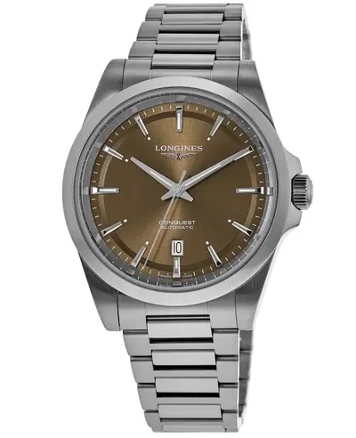 Brand New Authentic Longines Conquest Automatic watch with model number L3.830.4.62.6. Polished Stainless Steel watch band, Deployment clasp with Push Button. Smooth bezel. Brown Sunray dial featuring Luminous Silver Tone hands and Stick hour markers; Minute markers around outer rim, Date at 6 o'clock position. Swiss Automatic movement powered by the Longines Caliber L888 engine offering a 72-hour power reserve. Includes Hour, Minute, Second, Power Reserve, and Date functions (Date display). Screw down crown. Scratch Resistant Sapphire crystal lens. Round case shape measuring 41mm in diameter with thickness of 10.90mm. Transparent case back. Water resistant up to 100 meters / 330 feet.