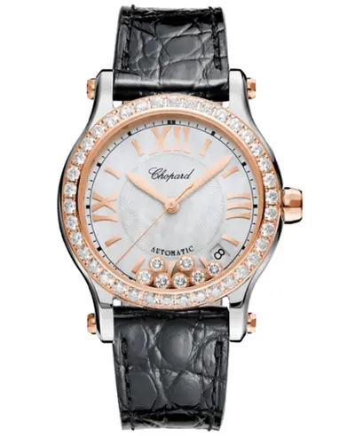 Brand new authentic Chopard Happy Sport medium automatic watch with mother-of-pearl dial and diamond bezel. Features a rose gold-tone stainless steel case, black alligator leather strap equipped with tang clasp closure. Equipped with an automatic self-winding movement providing hour, minute, second, and date functions. Possesses scratch-resistant sapphire crystal glass. Exhibits round case shape measuring 36mm diameter and approximately 12.30mm thickness. Includes a transparent case back. Rated at 30 meters or 100 feet water resistance depth. Comes with a standard 2-year Chopard WatchMaxx warranty.