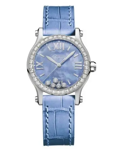 Authentic Brand New Chopard Happy Sport watch model 278573-3010. Features a stainless steel case, textured blue mother of pearl dial, and fixed diamond bezel. Equipped with automatic self-winding movement (automatic), displaying hours, minutes, and seconds. Comes complete with a genuine blue alligator leather strap featuring tang clasp closure. The watch is protected by scratch-resistant sapphire crystal and has a round 30mm case size. It features transparent case back and offers water resistance up to 30 meters (100 feet). Enjoyed under a 2 year WatchMaxx warranty.