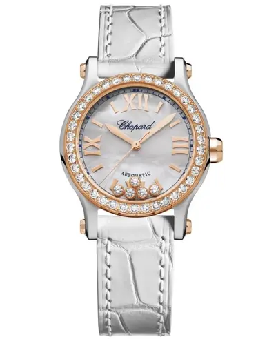 A new authentic Chopard women's watch model 278573-6020. Features a stainless steel and rose gold round case measuring 30mm in diameter with a thickness of 11.23mm, mother of pearl dial accented by Roman numeral hour markers, minute index markers on the outer rim, tone hands, five floating diamonds, sapphire crystal glass, automatic movement powered by Caliber 09.01-C, providing 42 hours power reserve and featuring second function. Comes with a transparent case back and includes water resistance up to 30 meters (100 feet), standard scratch resistant property, WatchMaxx warranty for two years.