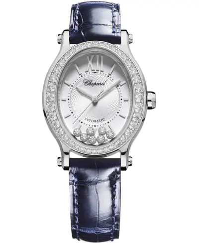 The Chopard Happy Sport Oval 7 is a women's watch featuring an oval stainless steel case, a silver dial adorned with Roman numeral/index hour markers and minute markers around the inner ring, complemented by seven floating diamonds. It comes equipped with a diamond leather strap and includes a fixed bezel set with diamonds. Powered by Chopard's automatic Caliber 09.01-C movement, this watch boasts a 42-hour power reserve, scratch-resistant sapphire crystal glass, water resistance up to 30 meters (or 100 feet), and is covered by a 2-year WatchMaxx warranty.
