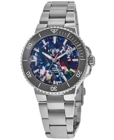 A new authentic Oris Aquis Date Upcycle watch featuring a multicolor dial. Constructed from brushed and polished stainless steel with a matching band, folding clasp, and ceramic bezel. Equipped with luminous silver tone hands and stick hour markers including minute markers around the outer rim and date display at 6 o'clock. Powered by Swiss automatic movement (733-1 engine) offering chronograph functions: date display via sub-dials or calendar complication visible at the six-hour mark. Includes screw-down crown, scratch-resistant sapphire crystal, unique case shape measuring 43.50mm, transparent case back, and is rated for 300 meters (990 feet) water resistance with a 2-year WatchMaxx warranty.