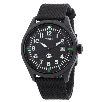 Black resin case with a black fabric strap, fixed black ceramic bezel, black dial with black hands and Arabic numeral hour markers, minute markers around the outer rim, analog dial type, date display at the 3 o'clock position, quartz movement, scratch resistant mineral crystal, pull/push crown, solid case back, round case shape, case size 43 mm, case thickness 10 mm, band width 22 mm, buckle clasp, water resistant to 30 meters / 100 feet, functions include date, hour, minute, second, part of the Expedition North series, casual watch style, Item Variations: TW2W23400JR
