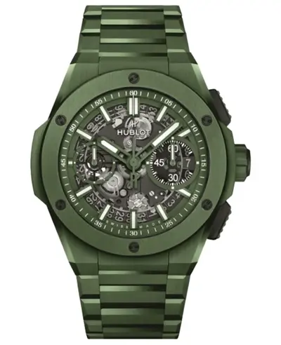 A new authentic Hublot Big Bang Chronograph Automatic Skeleton Dial watch with a green ceramic case and bracelet, model number 451.gx.5220.gx.