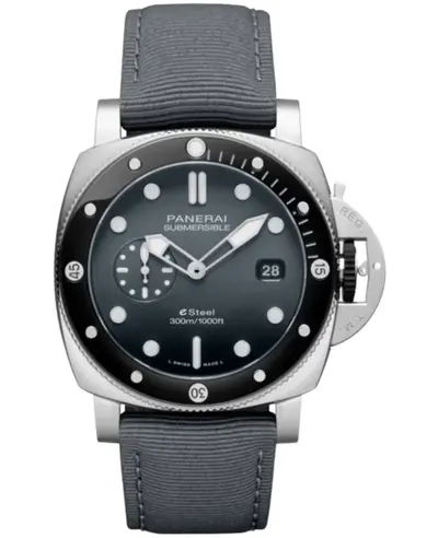 Authentic Panerai luxury men's automatic watch model PAM01288. Features a brushed eSteel case and matching brushed eSteel strap with stainless steel tang clasp. Equipped with unidirectional rotating bezel, scratch resistant sapphire crystal, cushion shaped case measuring 44mm in diameter. Movement is Swiss automatic Calibre P.900 providing 72 hours power reserve. Grey anthracite dial displays luminous silver tone hands and markers including a date sub-dial at the 3 o'clock position. Includes secondary black caoutchouc strap option, protected crown, and comes with a 2-year WatchMaxx warranty rated for up to 300 meters or 990 feet water resistance.