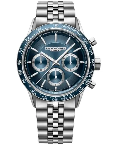 Automatic chronograph movement, blue dial with luminous silver tone hands and stick hour markers featuring minute markers around the outer rim. Includes three sub-dials displaying seconds, minutes (30), and hours (12). Brushed and polished stainless steel case and bracelet equipped with a polished stainless steel folding clasp and fixed ceramic bezel bearing tachymeter scale. Sapphire crystal scratch-resistant display cover. Functions: power reserve indicator, hour, minute, second, chronograph timer including speed measurement capability. Water resistant to 100 meters (330 feet). Case size 43.5mm, thickness 13.7mm with transparent case back.