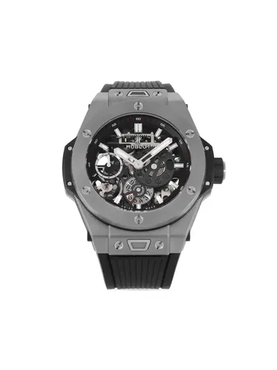 Hublot 2019 pre-owned Big Bang with a black round face baton dial featuring Arabic and skeleton elements. Equipped with a screw-down crown, titanium case, manual-winding movement, folding clasp, and baton hands. Comes complete with original box, papers, and BOUTIQUE certificate included. Movement repairs covered by the two-year BOUTIQUE warranty. Authenticated by BOUTIQUE-certified watchmakers. Condition: Good.