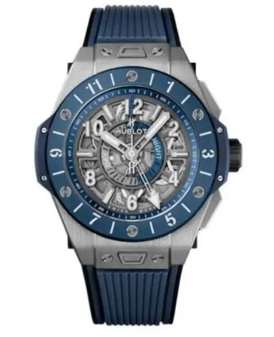 Luxury men's watch from Hublot model 471.nl.7112.rx, featuring a blue dial with luminous indices and Roman numerals, automatic movement (Hublot Calibre HUB1251) providing up to 72 hours power reserve, GMT function including day/night indicator for two time zones, fixed unidirectional rotating bezel, sapphire crystal resistant to scratches, titanium case in a brushed finish with polished details, blue rubber strap, and water resistance of 100 meters (330 feet).