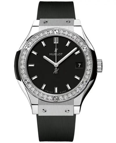 This authentic Hublot watch features a sleek design with its Titanium case and Black Rubber strap. It includes the push-in crown, scratch-resistant Sapphire crystal face, black dial, and is powered by a Battery Operated Quartz movement. With a Solid case back, this 33mm timepiece offers resistance to water under 50 Meters (165 Feet) depth. Comes with a standard WatchMaxx warranty for two years.
