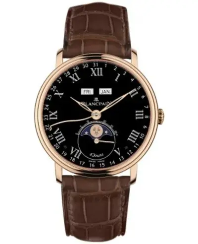 The Blancpain Villeret Complete Calendar 8 Jours Men's Watch Model No. 6639-3637-55B is a sophisticated automatic mechanical movement timepiece with an 18k rose gold case, black dial featuring the full calendar complication, brown crocodile leather strap equipped with deployment clasp, sapphire crystal with anti-reflective coating for scratch resistance and clarity, case size of 42mm diameter, thickness of 13.07mm, transparent case back displaying the automatic self-winding movement, water resistance to 30 meters (100 feet), and comes with a two-year WatchMaxx warranty.