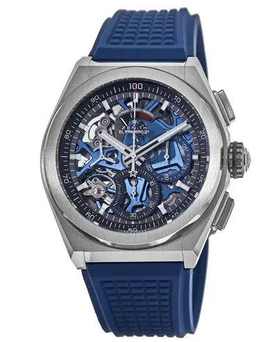 Brand New authentic Zenith watch, model Defy El Primero 21 with blue skeleton dial and rubber strap. Features a titanium brushed case, automatic chronometer movement (El Primero Caliber 9004), deployment clasp, fixed bezel, luminous silver-tone hands and index markers, power reserve indicator, round 44mm diameter face, sapphire crystal resistant to scratches, transparent case back, water resistance up to 100 meters or 330 feet.