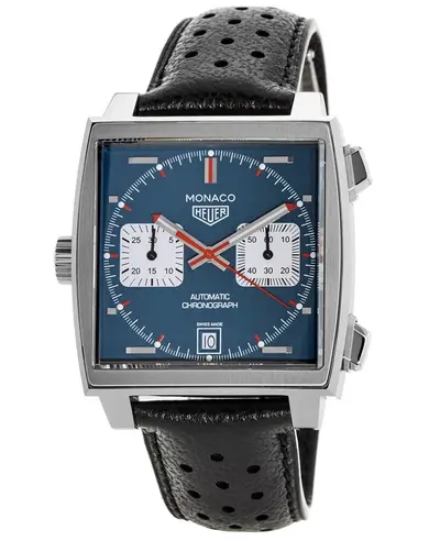 Brand new authentic Tag Heuer men's watch. Features a blue dial, automatic self-winding movement with mechanical chronograph functionality, stainless steel case and black leather strap. Equipped with a fixed bezel ring, scratch-resistant sapphire crystal lens, 100 meters water resistance (330 feet), and comes with a 2-year WatchMaxx warranty. Case size is 39mm.
