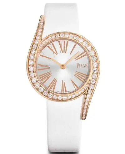 Women's watch by Piaget featuring a silver dial, rose gold-tone hands and Roman numeral hour markers. Equipped with a white satin strap and powered by the Piaget 59P quartz movement. Includes fixed diamond bezel with tang clasp, scratch-resistant sapphire crystal glass, round case measuring 26mm in diameter and 7mm thick. Solid case back. Water resistant up to 30 meters or 100 feet.