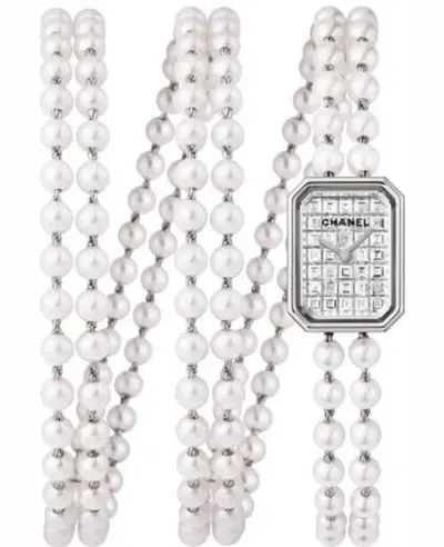 This is a Brand New Authentic Chanel watch, model H2032. It features an elegant white gold case and bracelet assembly. The dial displays diamonds set in silver-tone hands with 34 baguette-cut diamonds arranged on its surface. A diamond dial enhances its luxury appeal. The bracelet incorporates 194 Akoya cultured pearls on white gold strands, finished with sparkling brilliant-cut diamonds at the tips. Powered by a battery-operated quartz movement ensuring precise timekeeping. It has basic hour and minute functions only. Protected by sapphire crystal which is scratch-resistant. Features a rectangular case measuring 19mm x 15mm in size with solid back cover. Rated for 30 meters water resistance suitable for splashing but not swimming or diving. Comes with a two-year WatchMaxx warranty.