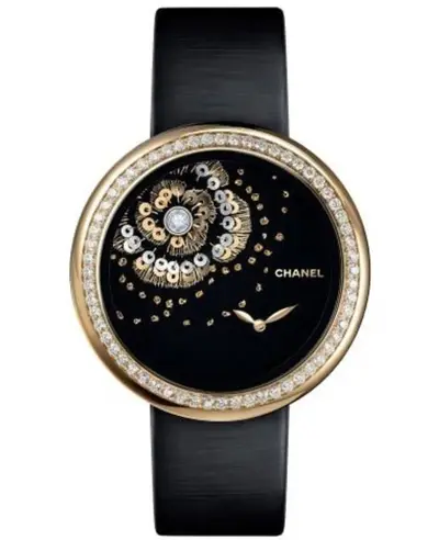 This is the brand new authentic Chanel Mademoiselle Prive watch model H3822, featuring an elegant round case in black dial with diamonds and a sophisticated black satin strap. The watch has an 18KT yellow gold case set with brilliant-cut diamonds. It includes a tang clasp, sapphire crystal resistant to scratches, battery-operated quartz movement for accurate timekeeping, displaying hours and minutes only. Water-resistant up to 30 meters (approx. 100 feet).