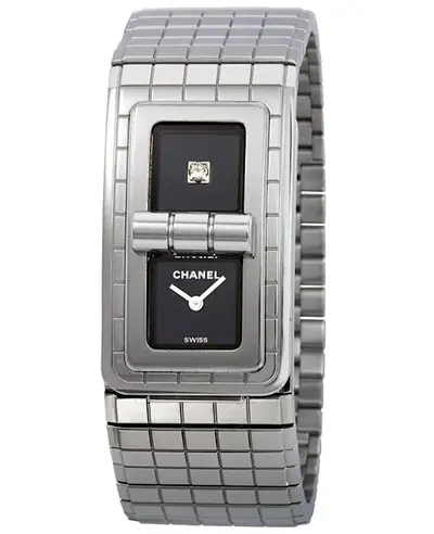 A 0.05 carat princess cut diamond at the 12 o'clock position on a black lacquered dial, case and bracelet made from stainless steel with ceramic elements, folding clasp closure, fixed bezel, quartz movement powered by battery, sapphire crystal resistant to scratches, rectangular case measuring 38.1mm x 21.5mm in width and thickness of 7.8mm respectively, solid case back, water resistance up to 30 meters (approximately 100 feet).