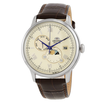 Men's Analog Watch, Silver-tone Stainless Steel Case and Brown Leather Strap. Fixed silver-tone bezel, Beige Dial with Blued Hands and Roman Numeral Hour Markers. Minute scale on inner rim, Date display at 3 o'clock, Two-day of the week subdials and moon phase indicator. Powered by Orient Calibre F6B24 Automatic Movement (approx. 21600 vph or 72 hours/day frequency), featuring 22 Jewels and a ~40-hour power reserve. Scratch-resistant mineral crystal glass, Pull/Push crown, transparent case back revealing the movement. Round shape measuring 41.5mm diameter and 14mm thickness. Strap width: 21 mm, equipped with buckle clasp. Water resistant to 30 meters or 100 feet depth. Functions include hours, minutes, seconds, date display. Part of Bambino Series, designed as a sport watch. Made in Japan.