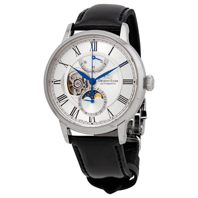 Stainless steel case with a black leather strap. Fixed stainless steel bezel. White (open heart) dial with black hands and Roman numeral hour markers. Minute markers around the outer rim. Dial Type: Analog. Date display at the 6 o'clock position. Combination date / moonphase sub-dial. Power reserve display. Automatic movement. Scratch resistant sapphire crystal. Pull / push crown. Transparent case back. Round case shape. Case size: 41 mm. Case thickness: 12 mm. Band width: 20 mm. Tang clasp. Water resistant at 50 meters / 165 feet. Functions: date, hour, minute, second. Orient Star Series. Dress watch style. Watch label: Japan Movt. Orient Orient Star Automatic White Dial Mens Watch RE-AY0106S00B.